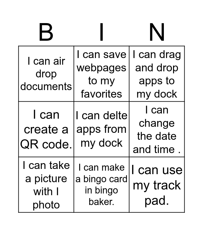 This bingo card has a free space and 8 words: I can change the date and time ., I can drag and drop apps to my dock, I can save webpages to my favorites, I can take a picture with I photo, I can air drop documents, I can use my track pad., I can create a QR code. and I can make a bingo card in bingo baker..