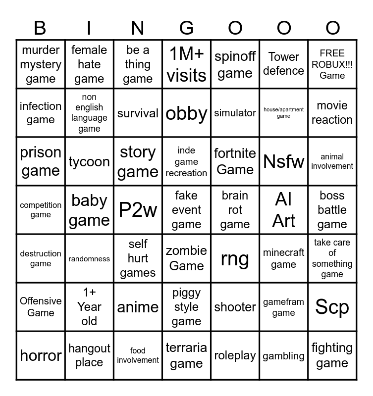 This bingo card has a free space and 48 words: shooter, house/apartment game, terraria game, baby game, story game, boss battle game, female hate game, hangout place, Tower defence, zombie Game, FREE ROBUX!!! Game, 1M+ visits, Nsfw, fortnite Game, Offensive Game, AI Art, infection game, movie reaction, gamefram game, spinoff game, simulator, P2w, murder mystery game, non english language game, Scp, survival, animal involvement, horror, inde game recreation, tycoon, gambling, brain rot game, take care of something game, 1+ Year old, competition game, rng, minecraft game, prison game, self hurt games, anime, destruction game, fighting game, be a thing game, food involvement, obby, piggy style game, randomness and roleplay.
