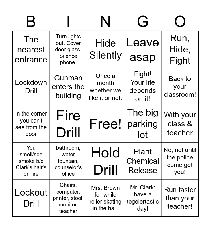 This bingo card has a free space and 29 words: Lockout Drill, Immediately, Fire Drill, Escaped Prisoner, The nearest entrance, Hide Silently, Gunman enters the building, bathroom, water fountain, counselor's office, The big parking lot, Chairs, computer, printer, stool, monitor, teacher, With your class & teacher, Run faster than your teacher!, Mrs. Brown fell while roller skating in the hall., Mr. Clark: have a tegelertastic day!, Back to your classroom!, Shelter Drill Hazmat, Hold Drill, You smell/see smoke b/c Clark's hair's on fire, Run, Hide, Fight, In the corner you can't see from the door, Plant Chemical Release, The Backstop, Fight! Your life depends on it!, Lockdown Drill, Leave asap, Turn lights out. Cover door glass. Silence phone., No, not until the police come get you!, Once a month whether we like it or not. and Blockade Door (use teacher if necessary).