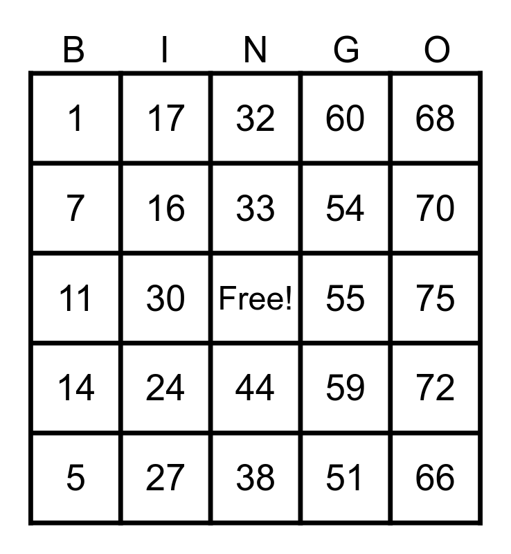 This bingo card has a free space and 24 words: 5, 24, 33, 51, 68, 1, 17, 32, 55, 75, 11, 16, 59, 72, 7, 27, 38, 60, 70, 14, 30, 44, 54 and 66.