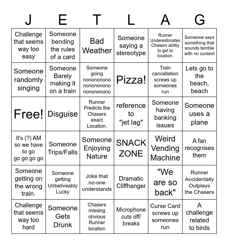This bingo card has 36 words: Dramatic Cliffhanger, Joke that no-one understands, Microphone cuts off/ breaks, Someone randomly singing, It's (?) AM so we have to go go go go go, reference to "jet lag", Someone Barely making it on a train, Chasers missing obvious Runner location, Runner Underestimates Chasers abiltiy to get to location., "We are so back", Lets go to the beach, beach, Someone saying a stereotype, Runner Accidentally Outplays the Chasers, Disguise, Pizza!, Challenge that seems way too easy, Someone getting on the wrong train., Someone having banking issues, Free!, Bad Weather, Runner Predicts the Chasers exact Location., Someone Trips/Falls, SNACK ZONE, Someone Enjoying Nature, Weird Vending Machine, Someone bending the rules of a card, Train cancellation screws up someones run, Someone Gets Drunk, Someone going nonononono nonononono nonononono, Someone says something that sounds terrible with no context, A challenge related to birds, Challenge that seems way too hard, A fan recognises them, Someone uses a plane, Someone getting Unbeliveably Lucky and Curse Card screws up someones run.