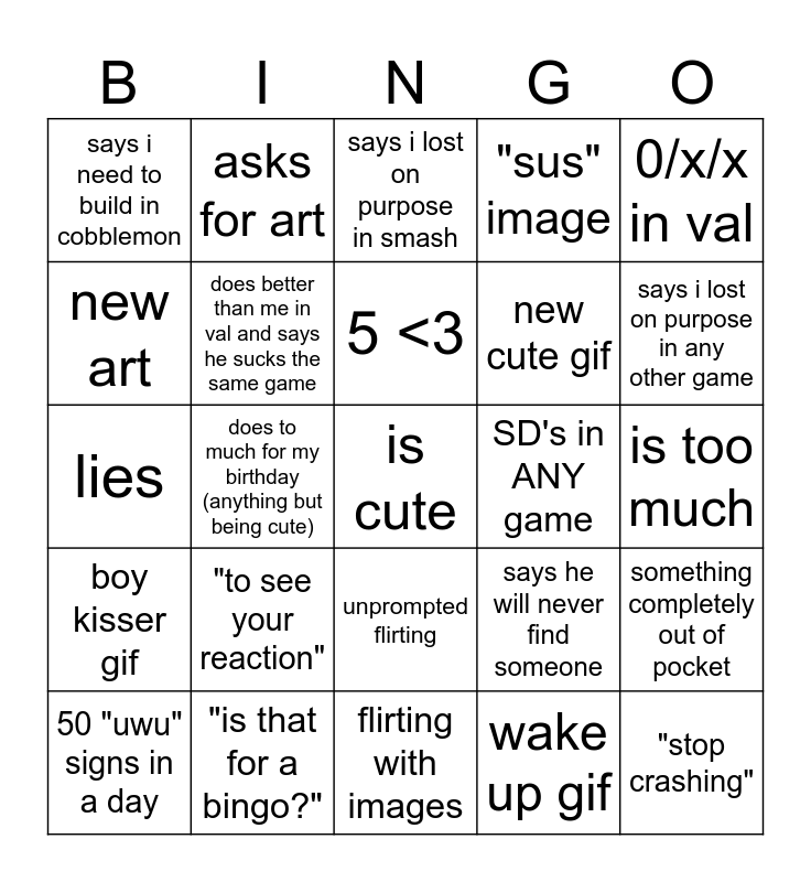 This bingo card has a free space and 24 words: "to see your reaction", "is that for a bingo?", 5 <3, 50 "uwu" signs in a day, 0/x/x in val, says i need to build in cobblemon, new art, asks for art, SD's in ANY game, unprompted flirting, new cute gif, lies, says he will never find someone, something completely out of pocket, does better than me in val and says he sucks the same game, wake up gif, is too much, says i lost on purpose in smash, says i lost on purpose in any other game, does to much for my birthday (anything but being cute), "stop crashing", boy kisser gif, "sus" image and flirting with images.