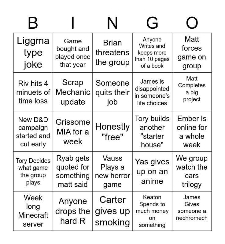 This bingo card has a free space and 24 words: Ryab gets quoted for something matt said, Anyone drops the hard R, Someone quits their job, Week long Minecraft server, Matt forces game on group, Liggma type joke, Riv hits 4 minuets of time loss, Game bought and played once that year, Tory builds another "starter house", Vauss Plays a new horror game, James is disappointed in someone's life choices, New D&D campaign started and cut early, Yas gives up on an anime, We group watch the cars trilogy, Scrap Mechanic update, Keaton Spends to much money on something, Ember Is online for a whole week, Brian threatens the group, Matt Completes a big project, Grissome MIA for a week, James Gives someone a nechromech, Tory Decides what game the group plays, Anyone Writes and keeps more than 10 pages of a book and Carter gives up smoking.