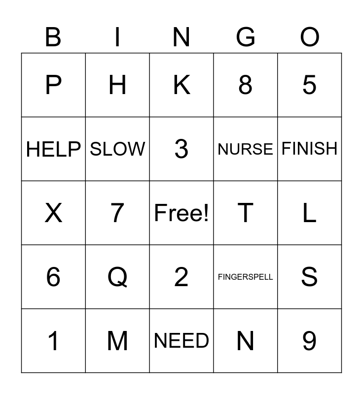 This bingo card has a free space and 39 words: YES, NO, DON'T UNDERSTAND, SLOW, 1, 2, 3, 4, 5, 6, 7, 8, 9, L, T, Q, B, P, BATHROOM, FINGERSPELL, HELP, NEED, NURSE, FINISH, A, C, D, F, G, H, I, J, K, M, N, R, S, X and Y.