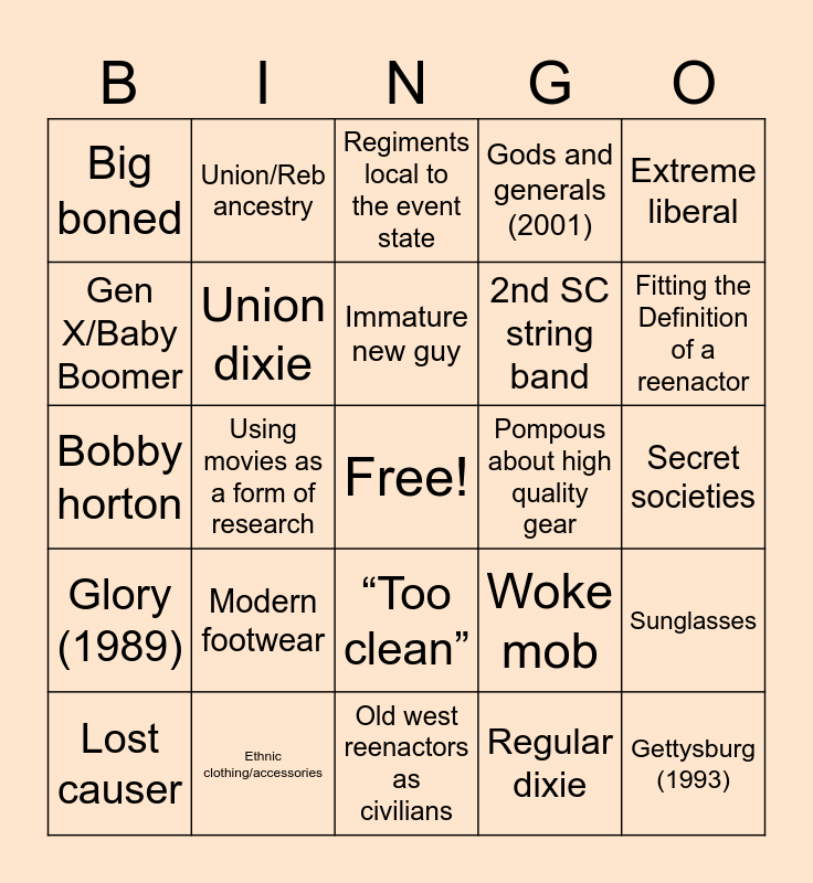 This bingo card has a free space and 24 words: Modern footwear, Ethnic clothing/accessories, Immature new guy, Lost causer, Extreme liberal, Big boned, Gen X/Baby Boomer, Union/Reb ancestry, Pompous about high quality gear, “Too clean”, 2nd SC string band, Bobby horton, Woke mob, Sunglasses, Union dixie, Regular dixie, Secret societies, Regiments local to the event state, Fitting the Definition of a reenactor, Using movies as a form of research, Gettysburg (1993), Glory (1989), Gods and generals (2001) and Old west reenactors as civilians.