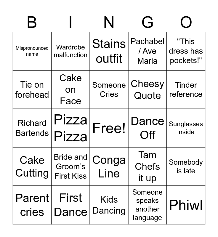 This bingo card has a free space and 24 words: Bride and Groom’s First Kiss, First Dance, Someone Cries, Parent cries, "This dress has pockets!", Mispronounced name, Tie on forehead, Wardrobe malfunction, Dance Off, Conga Line, Cheesy Quote, Richard Bartends, Tam Chefs it up, Somebody is late, Cake on Face, Someone speaks another language, Sunglasses inside, Stains outfit, Tinder reference, Pizza Pizza, Phiwl, Cake Cutting, Pachabel / Ave Maria and Kids Dancing.