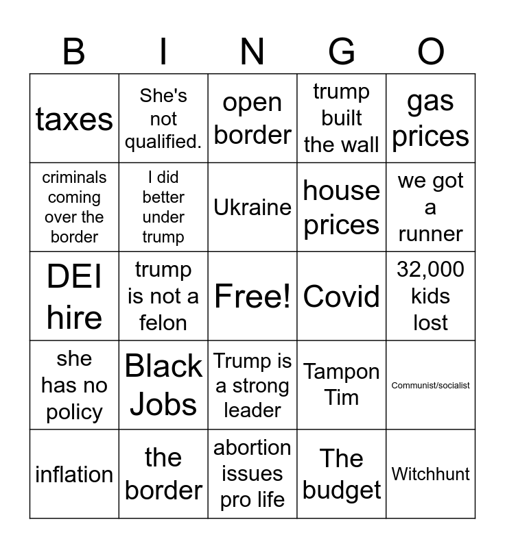 This bingo card has a free space and 24 words: Black Jobs, the border, Ukraine, inflation, gas prices, taxes, criminals coming over the border, She's not qualified., Covid, Trump is a strong leader, house prices, DEI hire, Tampon Tim, Communist/socialist, I did better under trump, The budget, 32,000 kids lost, open border, we got a runner, trump is not a felon, Witchhunt, she has no policy, trump built the wall and abortion issues pro life.