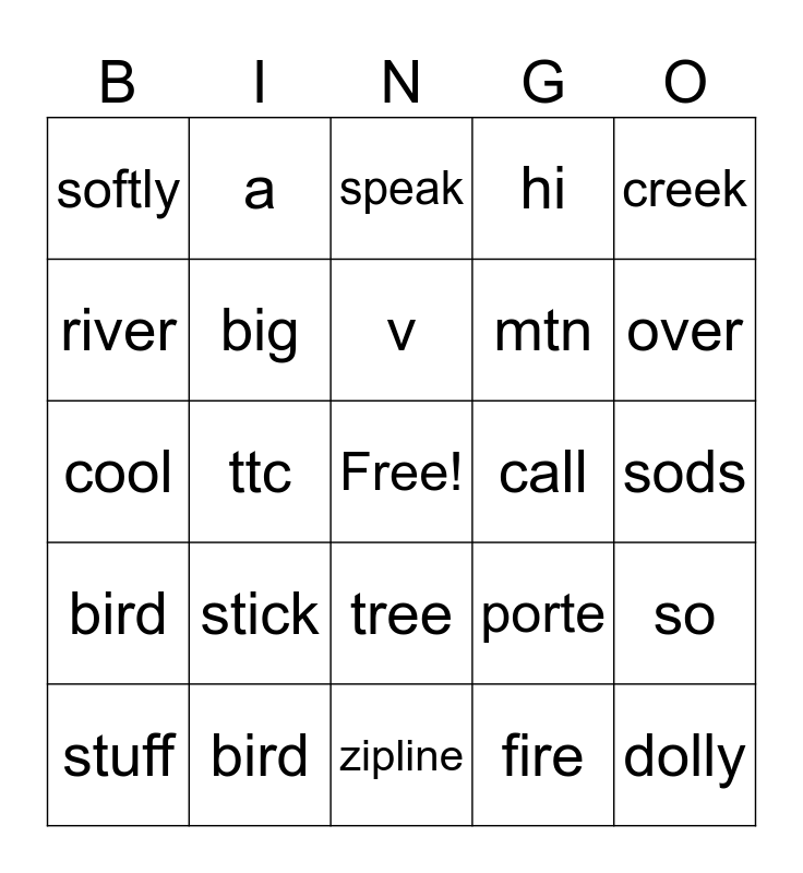 This bingo card has a free space and 29 words: stuff, history, ttc, quotes, softly, speak, big, stick, call, bird, sods, dolly, zipline, fire, over, sights, tree, bird, creek, cool, porte, crayon, mtn, river, hi, a, so, v and s.