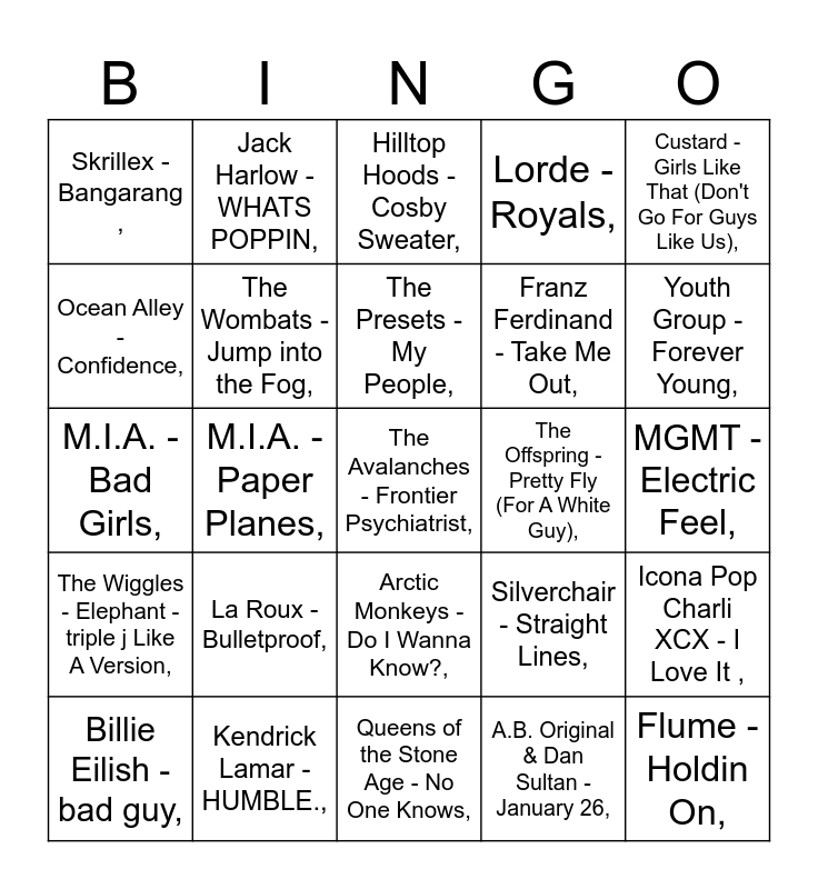 This bingo card has 54 words: Big Shaq - Man's Not Hot,, The Wiggles - Elephant - triple j Like A Version,, Doja Cat & SZA - Kiss Me More ,, Gotye & Kimbra - Somebody That I Used To Know,, Arctic Monkeys - Do I Wanna Know?,, Foster The People - Pumped Up Kicks,, Lorde - Royals,, Kendrick Lamar - King Kunta,, Ocean Alley - Confidence,, Flight Facilities - Crave You,, Skrillex - Bangarang ,, Macklemore & Ryan Lewis - Thrift Shop ,, Kendrick Lamar - HUMBLE.,, Billie Eilish - bad guy,, Calvin Harris - Feel So Close ,, Queens of the Stone Age - No One Knows,, The Avalanches - Frontier Psychiatrist,, Franz Ferdinand - Take Me Out,, The Wombats - Let's Dance to Joy Division,, MGMT - Electric Feel,, Silverchair - Straight Lines,, Cypress Hill - Hits from the Bong,, The Offspring - Pretty Fly (For A White Guy),, Custard - Girls Like That (Don't Go For Guys Like Us),, Genesis Owusu - Don't Need You,, Jack Harlow - WHATS POPPIN,, Tyler The Creator - EARFQUAKE,, Anderson .Paak - Bubblin,, Dune Rats - Scott Green,, A.B. Original & Dan Sultan - January 26,, Lana Del Rey - High By The Beach,, Skepta - Shutdown,, Tame Impala - Let It Happen,, Mark Ronson & Bruno Mars - Uptown Funk ,, Hilltop Hoods - Cosby Sweater,, Childish Gambino - 3005,, M.I.A. - Bad Girls,, Icona Pop Charli XCX - I Love It ,, Flume - Holdin On,, The Wombats - Jump into the Fog,, Darwin Deez - Radar Detector,, Sia - Clap Your Hands,, Ou Est Le Swimming Pool - Dance The Way I Feel,, Angus & Julia Stone - Big Jet Plane,, La Roux - Bulletproof,, Bluejuice - Broken Leg,, Bruno Mars Anderson .Paak Silk Sonic - Leave The Door Open,, Operator Please - Just A Song About Ping Pong,, The Presets - My People,, M.I.A. - Paper Planes,, Youth Group - Forever Young,, Lily Allen - Smile,, Spiderbait - Black Betty, and Kelis - Milkshake,.