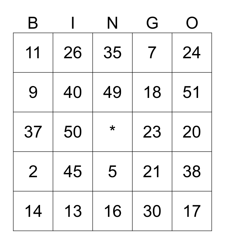 This bingo card has a free space and 54 words: 1, 2, 3, 4, 5, 6, 7, 8, 9, 10, 11, 12, 13, 14, 15, 16, 17, 18, 19, 20, 21, 22, 23, 24, 25, 26, 27, 28, 29, 30, 31, 32, 33, 34, 35, 36, 37, 38, 39, 40, 41, 42, 43, 44, 45, 46, 47, 48, 49, 50, 51, 52, 53 and 54.