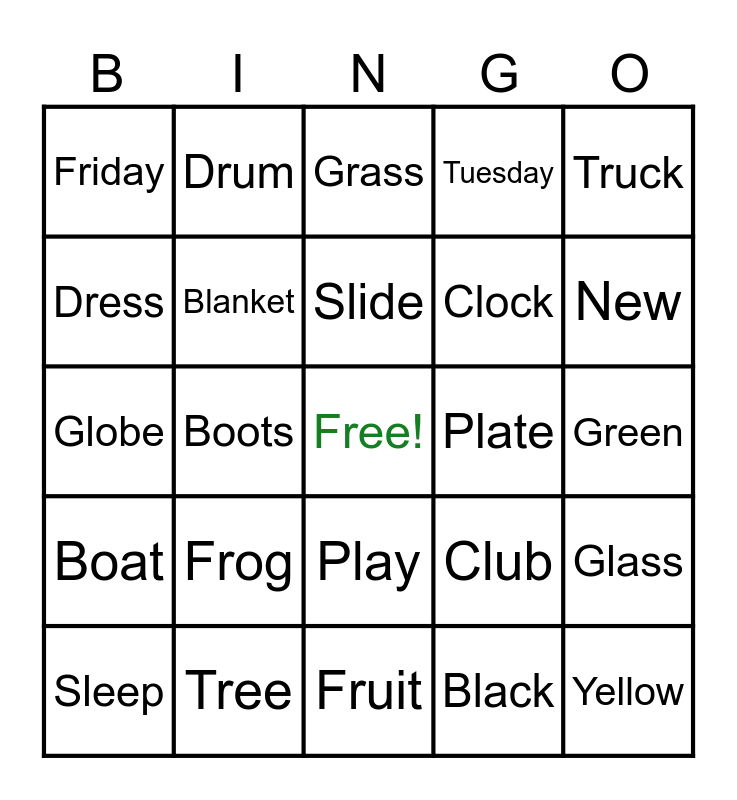 This bingo card has a free space and 24 words: Frog, Tree, Slide, Sleep, Truck, Friday, Dress, Drum, Plate, Play, Clock, Globe, Club, Glass, Blanket, Black, Green, Grass, New, Boots, Yellow, Boat, Tuesday and Fruit.