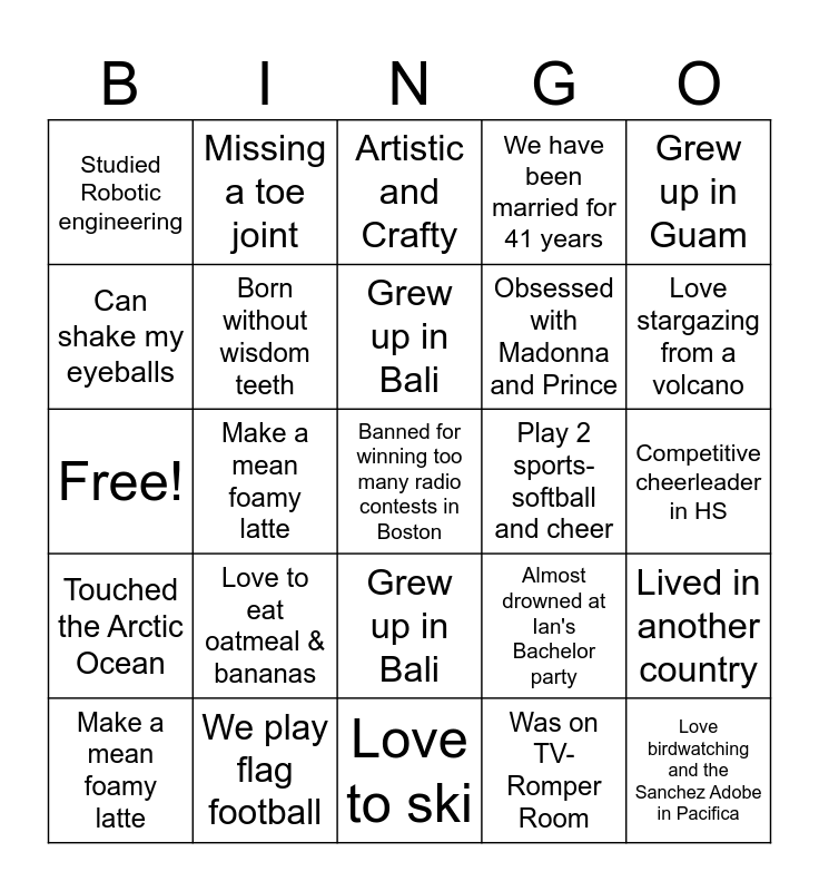 ⚠ This card has duplicate items: Been on the cover of a newspaper (2), Love birdwatching and the Sanchez Adobe in Pacifica (2), Competitive roller skater as a kid (2), In the movie Whiplash (2), Love stargazing from a volcano (2), Traveled with Ian in Europe twice! (2), Junior Girls Golf Champ 1976 (2), Love renovating doll houses (2), Having our first baby! (2), Arrested at Disneyland for jumping off Pirates (2), Built interactive exhibits for the Science Museum in Kayseri, Turkey (2), Banned for winning too many radio contests in Boston (2), Can shake my eyeballs (2), Grew up in Bali (2), In a rock band and practiced every weekend in Ian's garage (2), Born without wisdom teeth (2), Raced my Mustang in every track in CA (2), Grew up in Fiji (2), Can say the alphabet backwards (2), We retired in Phoenix (2), Love math and food (2), Make a wiked home brewed Kombucha (2), Heart Warrior (2), Make a mean foamy latte (2), Touched the Arctic Ocean (2), Was a driving school instructor (2), Related to Steve Buschemi (2), Family is from Laos (2), Drove the SF Ferry to Jack London Square (2), Would do anything for our family and friends (2), Sang the National Anthem in HS (2), Love to ski (2), Love snorkeling with manta rays (2), Play 2 sports-softball and cheer (2), Make snow (2), Lived in another country (2), Have hyperextended joints (2), Played on the National Swedish baseball team (2), Love giving hugs and reading (2), Parents of the Groom (2), Love working with leather (2), Almost drowned at Ian's Bachelor party (2), Love cooking different cuisines (2), Born ambidextrous (2), Grew up in Guam (2), Dance Tahitian Competitively (2), Lived in 7 states (2), Jamie's Battle Buddy for 24 years (2), Missing a toe joint (2), Born in the Philippines (2), We have been married for 41 years (2), Almost shut down OC water supply with a swab (2), Love birdwatching (2), Obsessed with beans (2), Crazy about cats (2), We ride Harleys (2), Competitive cheerleader in HS (2), Love riding dirt bikes (2), Me & my children have the same birthday (2), Studied Robotic engineering (2), Starting a home preschool (2), Could eat a hamburger everyday (2), Love to eat oatmeal & bananas (2), Was on TV- Romper Room (3), Speak English, Dutch and French (2), We play flag football (2), Won a pie eating contest (2), Experience premonitions (2)