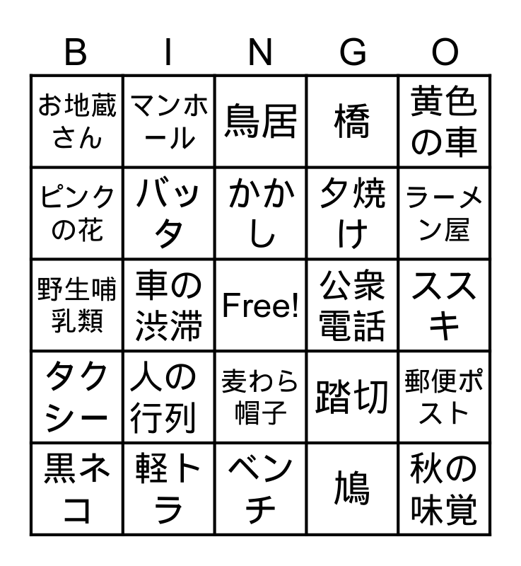 This bingo card has a free space and 24 words: 人の行列, 軽トラ, かかし, 黒ネコ, 黄色の車, お地蔵さん, ピンクの花, マンホール, 公衆電話, 麦わら帽子, 夕焼け, 野生哺乳類, 踏切, 郵便ポスト, バッタ, 鳩, ススキ, 鳥居, ラーメン屋, 車の渋滞, 秋の味覚, タクシー, 橋 and ベンチ.