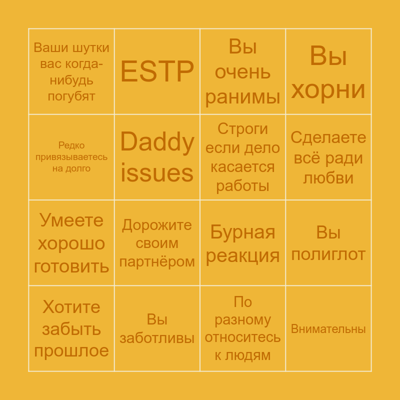 This bingo card has 16 words: Вы заботливы, Вы полиглот, Вы очень ранимы, Ваши шутки вас когда-нибудь погубят, Умеете хорошо готовить, ESTP, Бурная реакция, По разному относитесь к людям, Редко привязываетесь на долго, Daddy issues, Хотите забыть прошлое, Вы хорни, Дорожите своим партнëром, Сделаете всё ради любви, Строги если дело касается работы and Внимательны.