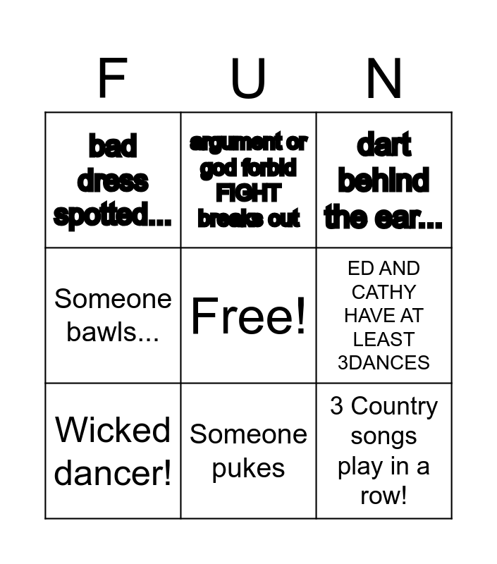 This bingo card has a free space and 15 words: Toes out of the shoes, Large Bling, dart behind the ear..., bad dress spotted..., Someone pukes, 3 Country songs play in a row!, Someone takes a tumble!, bad hair and makeup combo, ED AND CATHY HAVE AT LEAST 3DANCES, SOMEONE GETS WAY TOO DRUNK!, DJ calls for a "sociable!", Someone bawls..., Wicked dancer!, argument or god forbid FIGHT breaks out and i smell WEED!.