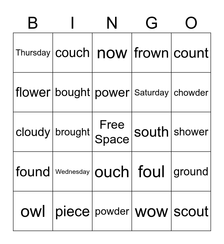 This bingo card has a free space and 24 words: Wednesday, piece, power, owl, count, Thursday, flower, couch, south, ouch, Saturday, cloudy, foul, ground, bought, wow, shower, now, chowder, brought, scout, found, frown and powder.