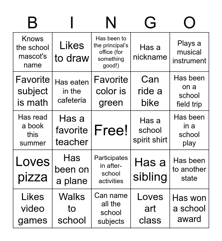 This bingo card has a free space and 30 words: Walks to school, Loves recess, Has a favorite teacher, Is in the school band, Knows the school mascot's name, Has been to the principal’s office (for something good!), Has eaten in the cafeteria, Participates in after-school activities, Has a school spirit shirt, Can name all the school subjects, Has been in a school play, Has won a school award, Loves art class, Knows the school rules, Has been on a school field trip, Has a pet, Has a sibling, Loves pizza, Has been on a plane, Plays a musical instrument, Has read a book this summer, Is wearing something blue, Likes to draw, Can ride a bike, Favorite subject is math, Has a nickname, Has been to another state, Likes video games, Favorite color is green and Can speak another language.