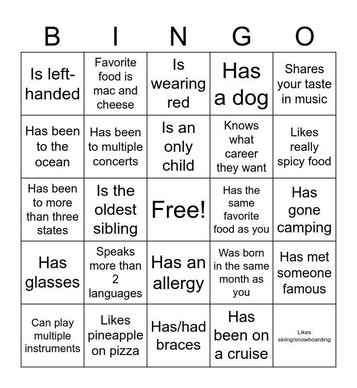 This bingo card has a free space and 24 words: Speaks more than 2 languages, Likes pineapple on pizza, Is an only child, Can play multiple instruments, Shares your taste in music, Is left-handed, Has been to the ocean, Favorite food is mac and cheese, Has the same favorite food as you, Has an allergy, Knows what career they want, Has been to more than three states, Was born in the same month as you, Has met someone famous, Has been to multiple concerts, Has been on a cruise, Has gone camping, Is wearing red, Likes really spicy food, Is the oldest sibling, Likes skiing/snowboarding, Has glasses, Has a dog and Has/had braces.