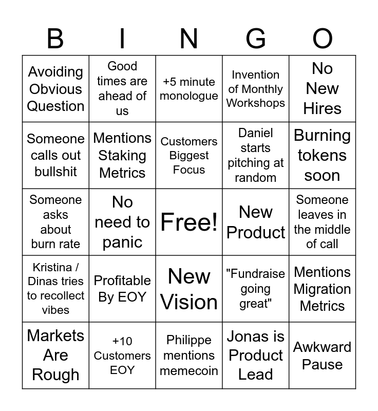 This bingo card has a free space and 24 words: Profitable By EOY, +10 Customers EOY, Customers Biggest Focus, Markets Are Rough, No New Hires, Avoiding Obvious Question, Someone calls out bullshit, Good times are ahead of us, New Product, New Vision, Daniel starts pitching at random, Someone asks about burn rate, "Fundraise going great", Mentions Migration Metrics, Mentions Staking Metrics, Jonas is Product Lead, Someone leaves in the middle of call, +5 minute monologue, Burning tokens soon, No need to panic, Awkward Pause, Kristina / Dinas tries to recollect vibes, Invention of Monthly Workshops and Philippe mentions memecoin.
