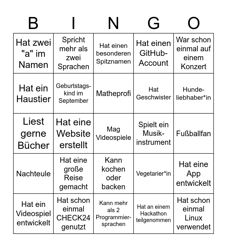 This bingo card has 25 words: Hat eine große Reise gemacht, Kann mehr als 2 Programmier-sprachen, Matheprofi, Hat ein Videospiel entwickelt, War schon einmal auf einem Konzert, Hat zwei "a" im Namen, Hat ein Haustier, Spricht mehr als zwei Sprachen, Spielt ein Musik-instrument, Kann kochen oder backen, Hat Geschwister, Liest gerne Bücher, Vegetarier*in, Hat eine App entwickelt, Geburtstags-kind im September, Hat schon einmal Linux verwendet, Fußballfan, Hat einen besonderen Spitznamen, Hunde-liebhaber*in, Hat eine Website erstellt, Mag Videospiele, Hat schon einmal CHECK24 genutzt, Nachteule, Hat einen GitHub-Account and Hat an einem Hackathon teilgenommen.