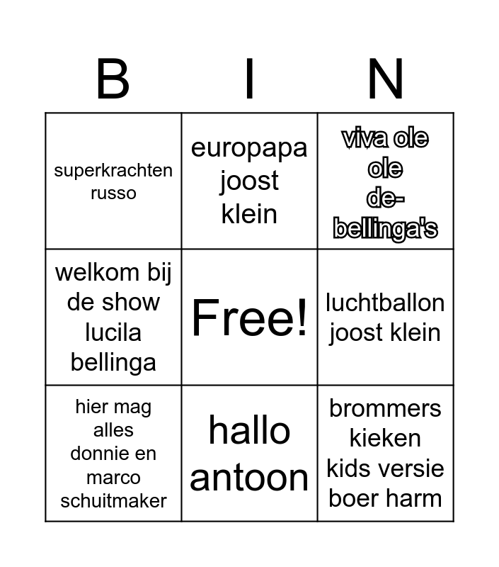 This bingo card has a free space and 8 words: luchtballon joost klein, viva ole ole de-bellinga's, europapa joost klein, hier mag alles donnie en marco schuitmaker, superkrachten russo, brommers kieken kids versie boer harm, welkom bij de show lucila bellinga and hallo antoon.