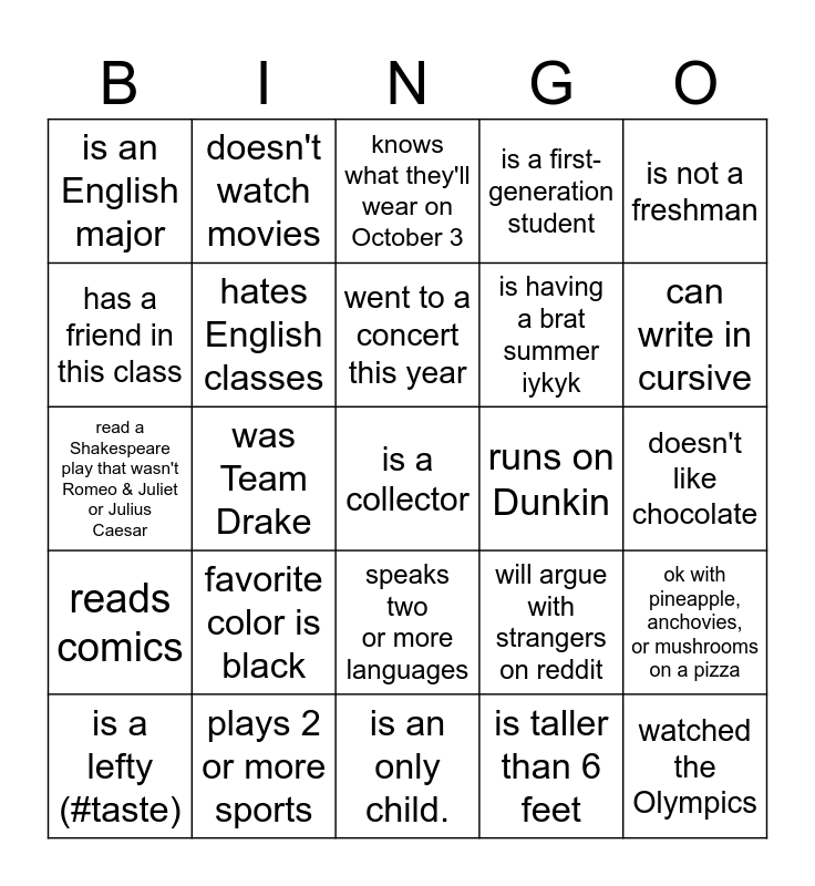 This bingo card has 25 words: favorite color is black, is an only child., went to a concert this year, is a lefty (#taste), is not a freshman, is an English major, has a friend in this class, doesn't watch movies, runs on Dunkin, speaks two or more languages, is having a brat summer iykyk, read a Shakespeare play that wasn't Romeo & Juliet or Julius Caesar, will argue with strangers on reddit, ok with pineapple, anchovies, or mushrooms on a pizza, hates English classes, watched the Olympics, doesn't like chocolate, knows what they'll wear on October 3, can write in cursive, was Team Drake, is a collector, plays 2 or more sports, reads comics, is a first-generation student and is taller than 6 feet.
