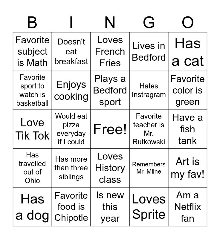 This bingo card has a free space and 24 words: Has more than three siblings, Favorite food is Chipotle, Plays a Bedford sport, Has a dog, Has a cat, Favorite subject is Math, Favorite sport to watch is basketball, Doesn't eat breakfast, Favorite teacher is Mr. Rutkowski, Loves History class, Hates Instragram, Love Tik Tok, Remembers Mr. Milne, Art is my fav!, Enjoys cooking, Loves Sprite, Have a fish tank, Loves French Fries, Favorite color is green, Would eat pizza everyday if I could, Am a Netflix fan, Has travelled out of Ohio, Lives in Bedford and Is new this year.