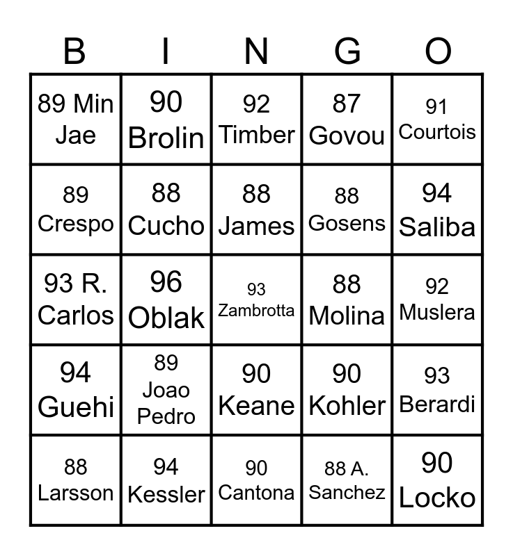 This bingo card has 25 words: 89 Joao Pedro, 90 Cantona, 88 James, 88 Larsson, 91 Courtois, 89 Min Jae, 89 Crespo, 90 Brolin, 88 Molina, 90 Keane, 88 Gosens, 93 R. Carlos, 90 Kohler, 93 Berardi, 88 Cucho, 90 Locko, 92 Muslera, 92 Timber, 94 Saliba, 96 Oblak, 93 Zambrotta, 94 Kessler, 94 Guehi, 87 Govou and 88 A. Sanchez.