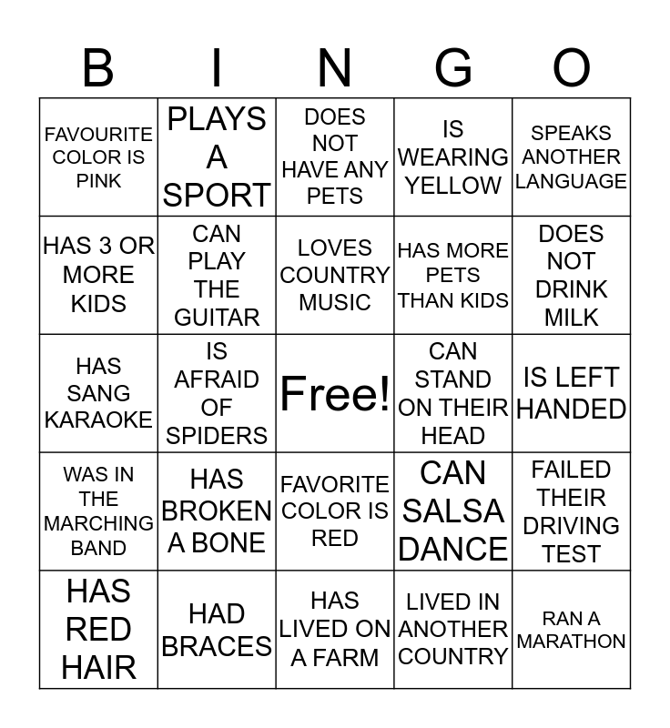 This bingo card has a free space and 24 words: HAS BROKEN A BONE, HAD BRACES, LOVES COUNTRY MUSIC, HAS RED HAIR, SPEAKS ANOTHER LANGUAGE, FAVOURITE COLOR IS PINK, HAS 3 OR MORE KIDS, PLAYS A SPORT, CAN STAND ON THEIR HEAD, FAVORITE COLOR IS RED, HAS MORE PETS THAN KIDS, HAS SANG KARAOKE, CAN SALSA DANCE, FAILED THEIR DRIVING TEST, CAN PLAY THE GUITAR, LIVED IN ANOTHER COUNTRY, IS LEFT HANDED, DOES NOT HAVE ANY PETS, DOES NOT DRINK MILK, IS AFRAID OF SPIDERS, RAN A MARATHON, WAS IN THE MARCHING BAND, IS WEARING YELLOW and HAS LIVED ON A FARM.