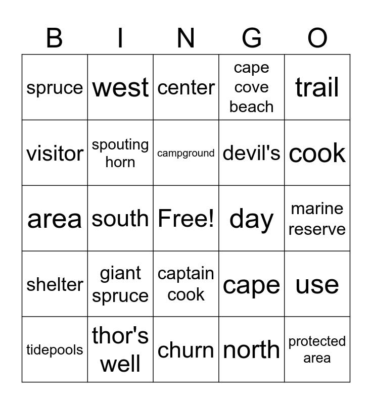 This bingo card has a free space and 27 words: cape, perpetua, devil's, churn, visitor, center, west, shelter, day, use, area, cape cove beach, tidepools, thor's well, cook, chasm, spouting horn, campground, giant spruce, spruce, marine reserve, north, south, protected area, captain cook, trail and cape cove.