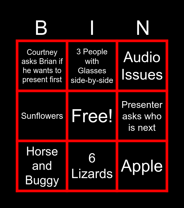 This bingo card has a free space and 13 words: Beetlejuice, El Camino, Horse and Buggy, 3 People with Glasses side-by-side, Sunflowers, Apple, Tropical Location, Ninja, 6 Lizards, Courtney asks Brian if he wants to present first, Presenter asks who is next, Audio Issues and Leadership mentions Time Tracking.