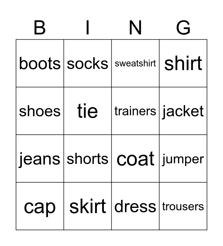 This bingo card has 16 words: skirt, jumper, sweatshirt, boots, jeans, socks, coat, dress, shoes, tie, cap, shirt, shorts, jacket, trainers and trousers.