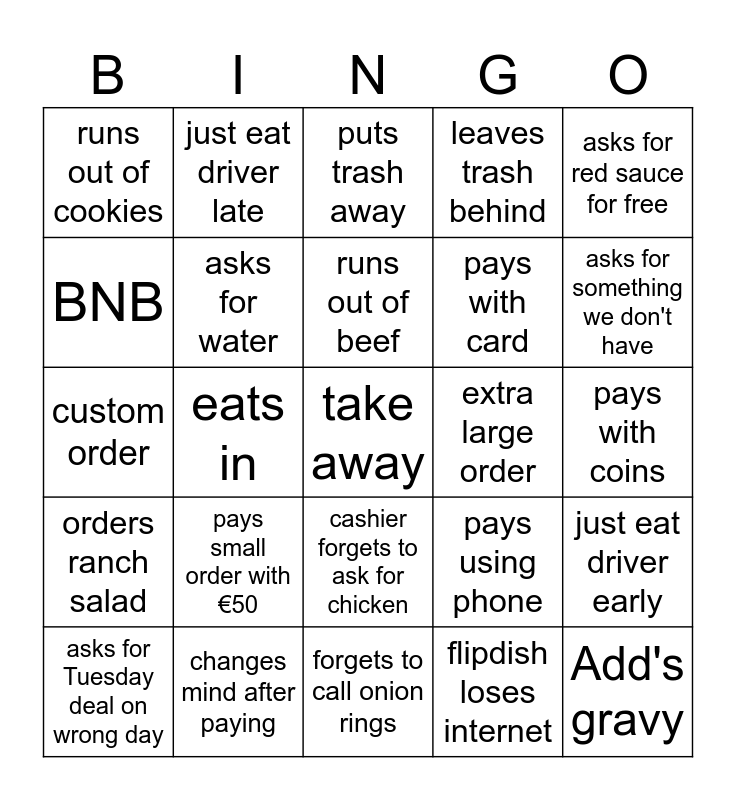 This bingo card has 25 words: orders ranch salad, changes mind after paying, take away, flipdish loses internet, asks for red sauce for free, runs out of cookies, just eat driver late, puts trash away, extra large order, just eat driver early, BNB, asks for water, forgets to call onion rings, pays using phone, asks for something we don't have, asks for Tuesday deal on wrong day, eats in, runs out of beef, pays with card, pays with coins, custom order, pays small order with €50, cashier forgets to ask for chicken, leaves trash behind and Add's gravy.