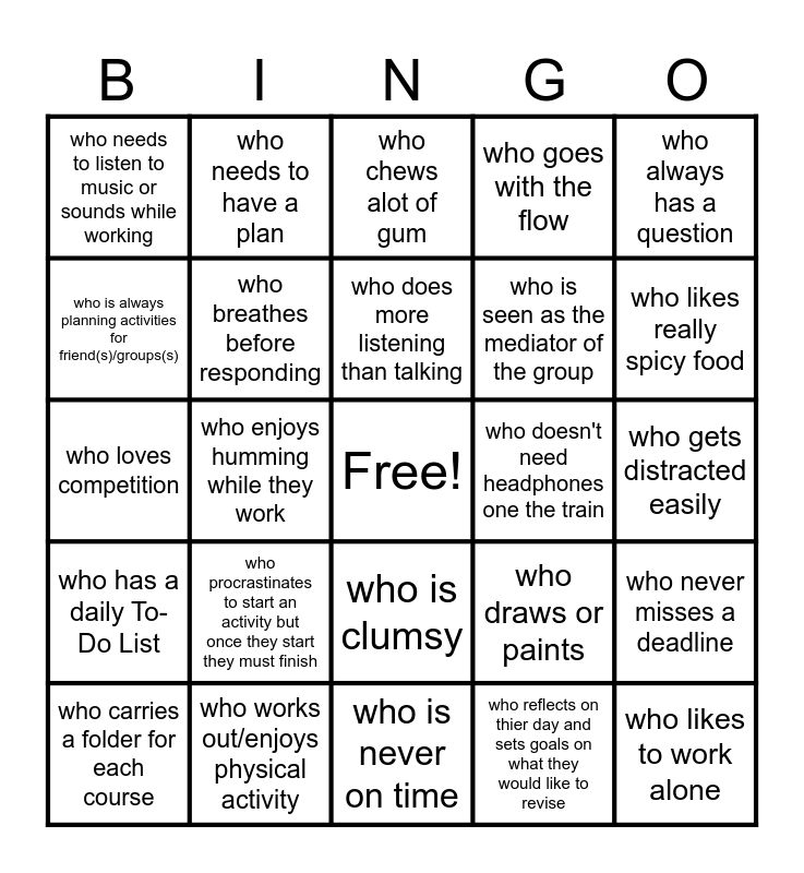 This bingo card has a free space and 29 words: who carries a folder for each course, who expects the unexpected, who enjoys humming while they work, who loves rollercoasters and thrill-seeking activities, who needs to listen to music or sounds while working, who chews alot of gum, who breathes before responding, who procrastinates to start an activity but once they start they must finish, who doesn't need headphones one the train, who works out/enjoys physical activity, who gets distracted easily, who likes to work alone, who is never on time, who reflects on thier day and sets goals on what they would like to revise, who likes really spicy food, who enjoys strong fragrance, who is clumsy, who has a daily To-Do List, who always has a question, who loves competition, who draws or paints, who prefers to hangout with friends spontaniously, who is seen as the mediator of the group, who is always planning activities for friend(s)/groups(s), who goes with the flow, who needs to have a plan, who never misses a deadline, who does more listening than talking and who remembers everyones birthday and/or numbers.