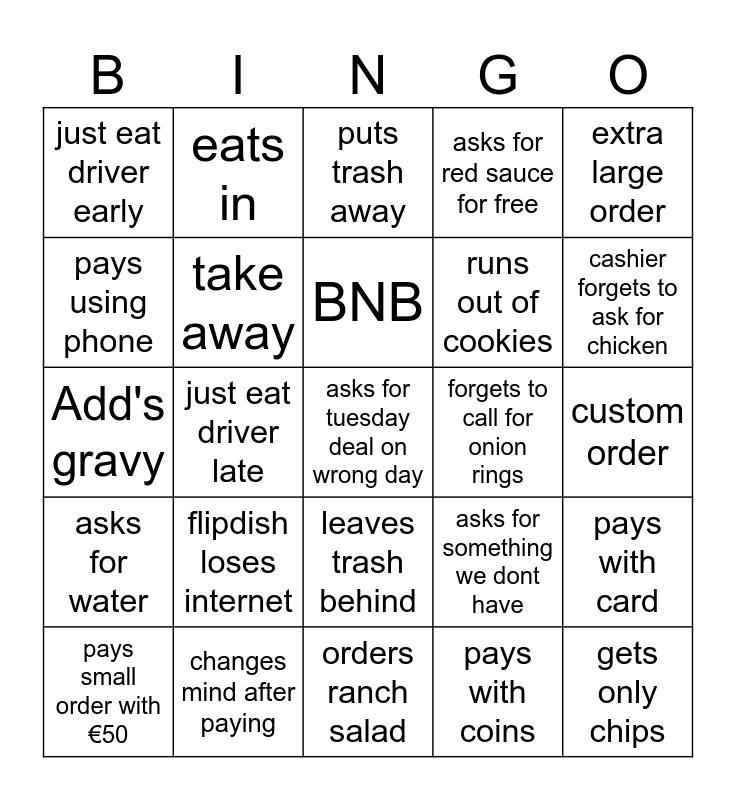 This bingo card has 25 words: asks for water, changes mind after paying, asks for tuesday deal on wrong day, pays with coins, extra large order, just eat driver early, eats in, puts trash away, forgets to call for onion rings, pays with card, pays using phone, take away, orders ranch salad, asks for something we dont have, cashier forgets to ask for chicken, pays small order with €50, just eat driver late, BNB, runs out of cookies, custom order, Add's gravy, flipdish loses internet, leaves trash behind, asks for red sauce for free and gets only chips.