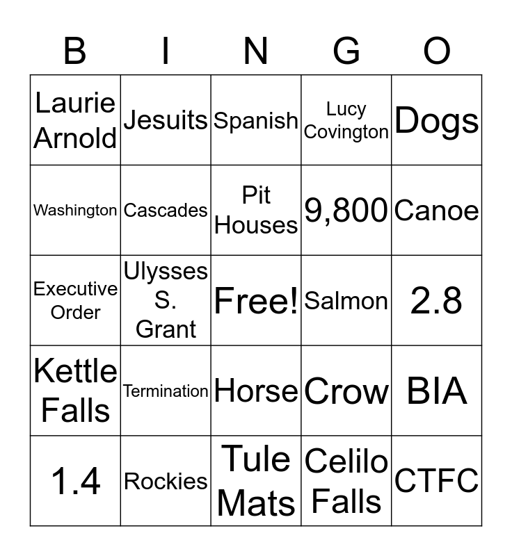This bingo card has a free space and 24 words: Termination, Rockies, Pit Houses, 1.4, Dogs, Laurie Arnold, Washington, Jesuits, Salmon, Horse, 9,800, Executive Order, Crow, BIA, Cascades, Celilo Falls, 2.8, Spanish, Canoe, Ulysses S. Grant, CTFC, Kettle Falls, Lucy Covington and Tule Mats.