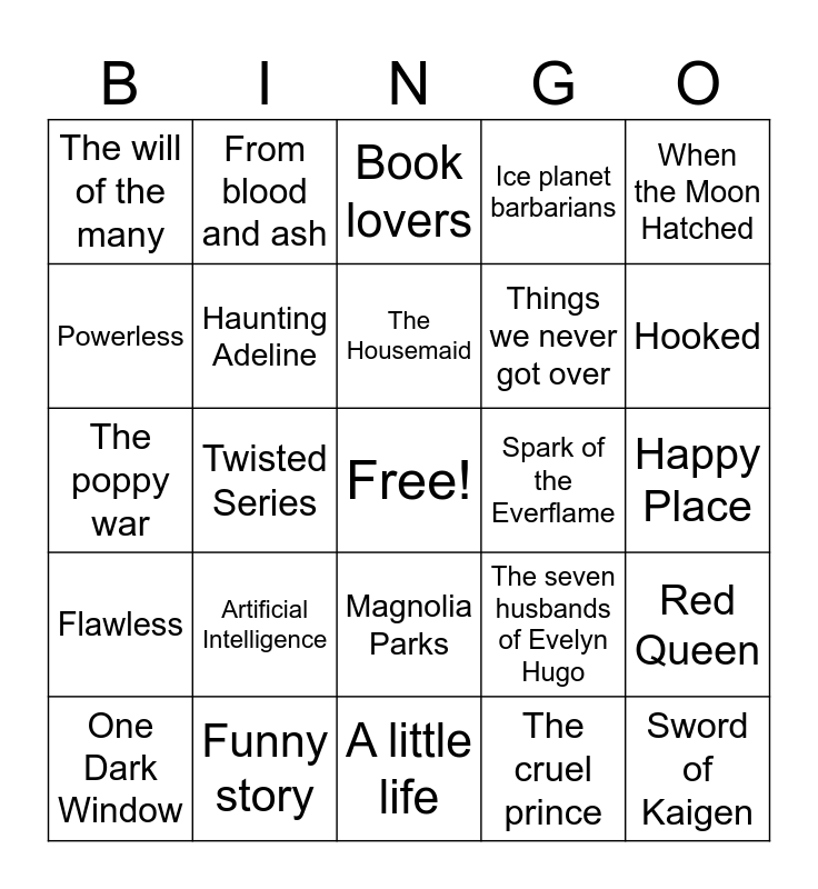This bingo card has a free space and 39 words: A court of thorns and Roses, Red Rising, Icebreaker, Haunting Adeline, One Dark Window, Magnolia Parks, The Housemaid, Fourth Wing, When the Moon Hatched, Flawless, Twisted Series, Ice planet barbarians, Sword of Kaigen, Happy Place, Spark of the Everflame, Artificial Intelligence, Empire of silence, The will of the many, Verity, The seven husbands of Evelyn Hugo, Powerless, A little life, Things we never got over, Hooked, Divine rivals, Serpent and the wings of night, Corrupt series, Credence, Birthday girl, From blood and ash, Throne of glass, Crescent city, Book lovers, Funny story, The cruel prince, It ends with us, Red Queen, The poppy war and The things we left unfinished.