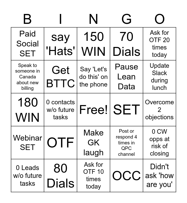 This bingo card has a free space and 24 words: OTF, 80 Dials, Say 'Let's do this' on the phone, 0 Leads w/o future tasks, Ask for OTF 20 times today, Paid Social SET, Speak to someone in Canada about new billing, say 'Hats', SET, Make GK laugh, Pause Lean Data, 180 WIN, Post or respond 4 times in QPC channel, 0 CW opps at risk of closing, Get BTTC, OCC, Overcome 2 objections, 150 WIN, Update Slack during lunch, 0 contacts w/o future tasks, Didn't ask 'how are you', Webinar SET, 70 Dials and Ask for OTF 10 times today.