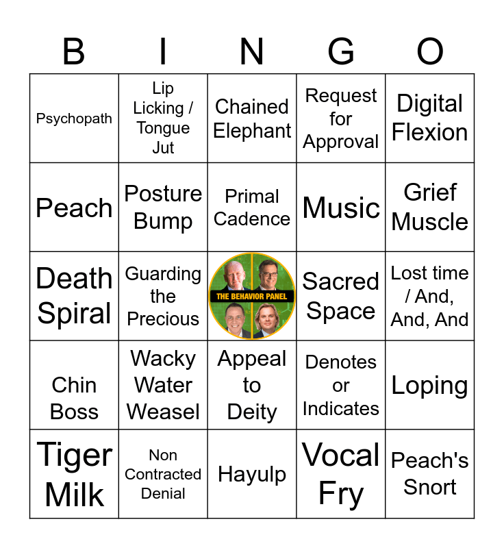This bingo card has a free space and 85 words: Chaff and Redirect, Word Salad, Chained Elephant, Extra Face, Narcissist, Fading Facts, Truth Plane, Eye Blocking, Blink Rate, Lip Licking, Primal Cadence, Grief Muscle, Posture Bump, Sacred Space, Regulators or Moderators, Psychopath, Tiger Milk, Peach, Hattie, Horses, Southern, Music, Peach's Snort, Grand Narrative, Guarding the Precious, Bring the Monkey to the Dance, Gum Chew Rate, Psychopath Goes Out for Chinese Dinner, I'm Just a Girl, Smug Eyes, Wacky Water Weasel, Turtling, Steepling, Death Spiral, Tongue Jut, Worm On A Griddle, Hayulp, Sympathy Funnel, Chin Boss, Grief Muscle, Pokey, Talking on Mute, Chaff and Redirect, Word Salad, Extra Face, Narcissist, Fading Facts, Truth Plane, Eye Blocking, Blink Rate, Lip Licking / Tongue Jut, Primal Cadence, Grief Muscle, BTOE, Verbal Click, Vanishing Perpetrator, Non Contracted Denial, Request for Approval, Regulators or Moderators, Adaptors or Illustrators, Barriers, Military, SERE, G7, Brow-beating, Digital Flexion, Sway Rate, Loping, Closed Eyes Talker, Guilty Knowledge, Resume Statement, Fight Or Flight, Chin Boss, Talking on Mute, Pokey, Appeal to Deity, Vocal Fry, Who Says/ Does That?, Baseline, Archetypal / Heroes Journey, Lost time / And, And, And, Body Narration, Stress, Denotes or Indicates and Dupers Delight.