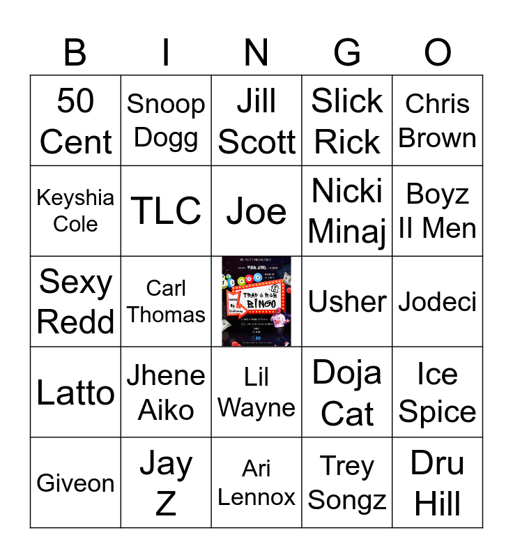 This bingo card has a free space and 24 words: Jhene Aiko, Jay Z, Joe, Giveon, Chris Brown, 50 Cent, Keyshia Cole, Snoop Dogg, Usher, Lil Wayne, Nicki Minaj, Sexy Redd, Doja Cat, Ice Spice, TLC, Trey Songz, Jodeci, Jill Scott, Boyz II Men, Carl Thomas, Dru Hill, Latto, Slick Rick and Ari Lennox.