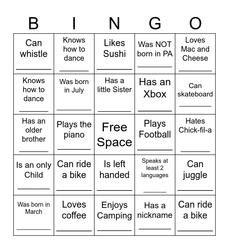 This bingo card has a free space and 32 words: Has a nickname _______, Is wearing jeans ________, Plays the piano _______, Has a Dog _______, Is an only Child _______, Was born in July _________, Loves Mac and Cheese ________, Can juggle _______, Knows how to dance _______, Hates Pizza _______, Has a little Sister ________, Likes Sushi _______, Wrestles for school ________, Can whistle _______, Plays Football _______, Was NOT born in PA ________, Was born in March __________, Has an older brother _______, Is left handed _______, Can ride a bike _______, Speaks at least 2 languages _______, Plays soccer _______, Hates Chick-fil-a _______, Loves coffee _______, Can ride a bike _______, Was NOT born in PA ________, Has an Xbox ______, Knows how to dance _______, Can whistle _______, Enjoys Camping _______, Has a nickname _______ and Can skateboard ________.