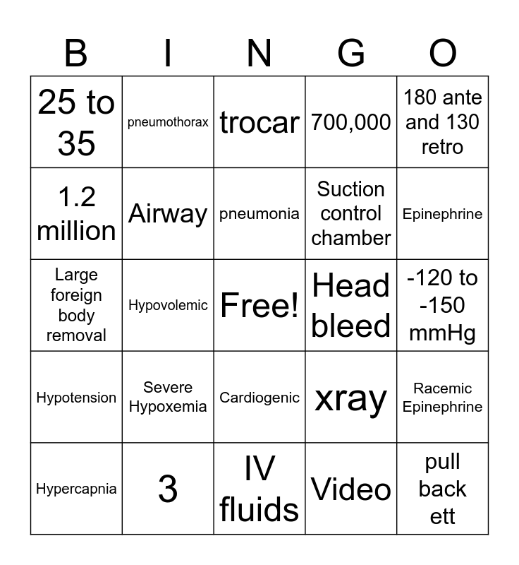 This bingo card has a free space and 24 words: Severe Hypoxemia, 3, pneumonia, Hypercapnia, 180 ante and 130 retro, 25 to 35, 1.2 million, pneumothorax, Head bleed, Cardiogenic, Suction control chamber, Large foreign body removal, xray, Racemic Epinephrine, Airway, Video, -120 to -150 mmHg, trocar, Epinephrine, Hypovolemic, pull back ett, Hypotension, 700,000 and IV fluids.