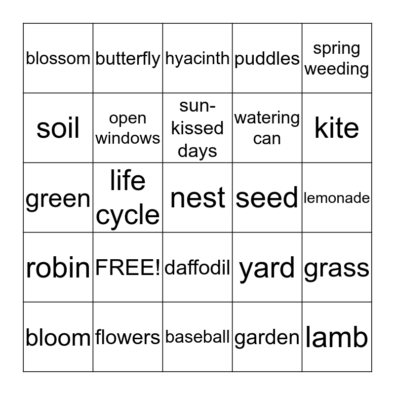 This bingo card has 25 words: FREE!, baseball, sun-kissed days, bloom, spring weeding, blossom, soil, butterfly, seed, daffodil, watering can, green, yard, grass, open windows, lamb, lemonade, hyacinth, kite, life cycle, nest, flowers, robin, puddles and garden.