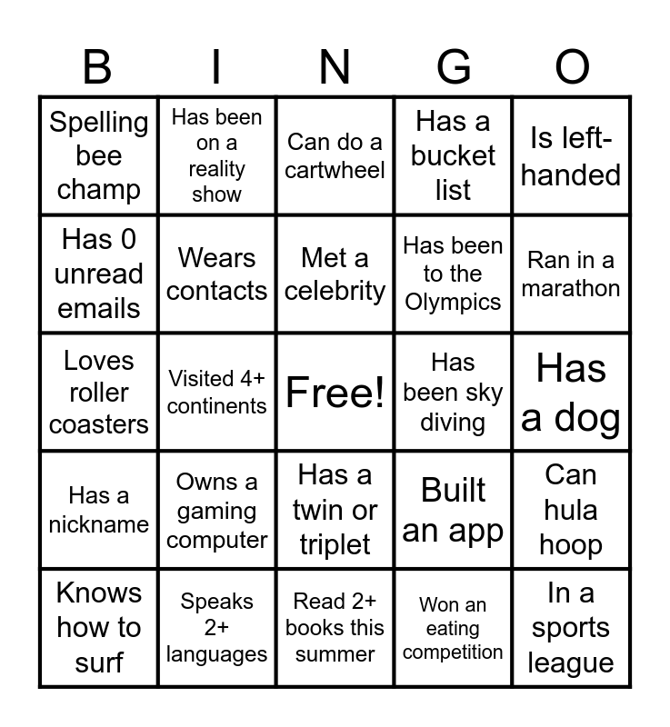 This bingo card has a free space and 24 words: Owns a gaming computer, Speaks 2+ languages, Met a celebrity, Knows how to surf, Is left-handed, Spelling bee champ, Has 0 unread emails, Has been on a reality show, Has been sky diving, Has a twin or triplet, Has been to the Olympics, Loves roller coasters, Built an app, Can hula hoop, Wears contacts, Won an eating competition, Has a dog, Can do a cartwheel, Ran in a marathon, Visited 4+ continents, In a sports league, Has a nickname, Has a bucket list and Read 2+ books this summer.