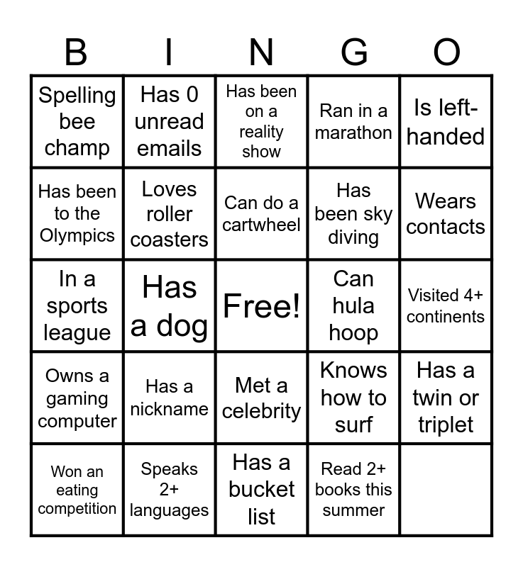 This bingo card has a free space and 24 words: Owns a gaming computer, Speaks 2+ languages, Met a celebrity, Knows how to surf, Is left-handed, Spelling bee champ, Has 0 unread emails, Has been on a reality show, Has been sky diving, Has a twin or triplet, Has been to the Olympics, Loves roller coasters, Built an app, Can hula hoop, Wears contacts, Won an eating competition, Has a dog, Can do a cartwheel, Ran in a marathon, Visited 4+ continents, In a sports league, Has a nickname, Has a bucket list and Read 2+ books this summer.
