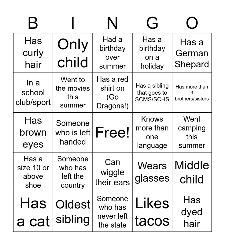 This bingo card has a free space and 24 words: Someone who has left the country, Oldest sibling, Has a red shirt on (Go Dragons!), Has a cat, Has a German Shepard, Has curly hair, In a school club/sport, Only child, Knows more than one language, Can wiggle their ears, Has a sibling that goes to SCMS/SCHS, Has brown eyes, Wears glasses, Middle child, Went to the movies this summer, Likes tacos, Went camping this summer, Had a birthday over summer, Has more than 3 brothers/sisters, Someone who is left handed, Has dyed hair, Has a size 10 or above shoe, Has a birthday on a holiday and Someone who has never left the state.