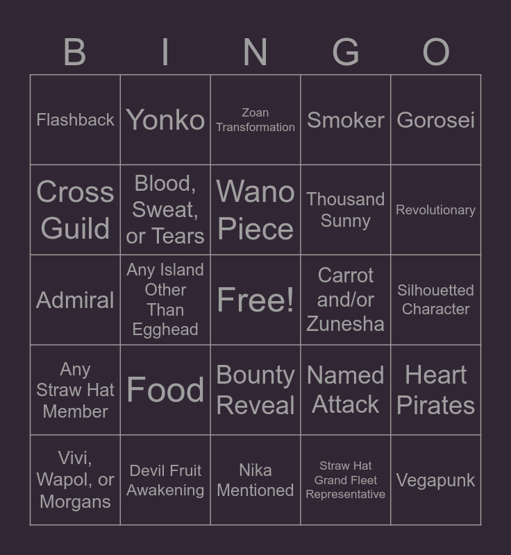 This bingo card has a free space and 29 words: Vivi, Wapol, or Morgans, Kid Pirates, Any Island Other Than Egghead, New Named Devil Fruit, Flashback, Zoan Transformation, Blood, Sweat, or Tears, Food, Carrot and/or Zunesha, Devil Fruit Awakening, Silhouetted Character, Vegapunk, Nika Mentioned, Straw Hat Grand Fleet Representative, Revolutionary, Joy Boy Mentioned, Bounty Reveal, Any Straw Hat Member, Gorosei, Admiral, Named Attack, Seraphim, Thousand Sunny, Cross Guild, Smoker, Yonko, Heart Pirates, Wano Piece and Cipher Pol.