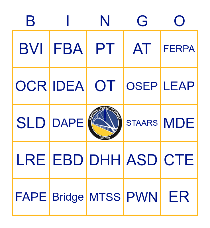 This bingo card has a free space and 34 words: PLAAFP, PWN, IEP, PBSP, LRE, IDEA, FERPA, FAPE, FBA, SLP, OT, PT, ESY, ECSE, STAARS, LEAP, Bridge, SLD, EBD, ASD, DHH, OHD, BVI, MDE, MTSS, ER, AT, IAEP, OSEP, OCR, PBIS, DAPE, CTE and DNQ.