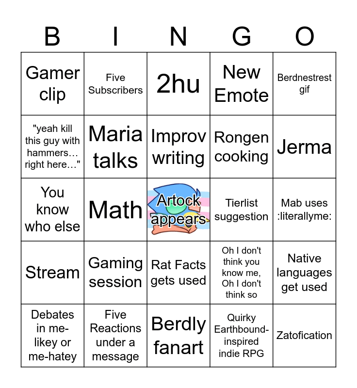 This bingo card has a free space and 24 words: Gaming session, Five Reactions under a message, Improv writing, Debates in me-likey or me-hatey, Berdnestrest gif, Gamer clip, "yeah kill this guy with hammers… right here…", Five Subscribers, Tierlist suggestion, Rat Facts gets used, Rongen cooking, You know who else, Oh I don't think you know me, Oh I don't think so, Native languages get used, Maria talks, Quirky Earthbound-inspired indie RPG, Mab uses :literallyme:, 2hu, Jerma, Math, Zatofication, Stream, New Emote and Berdly fanart.