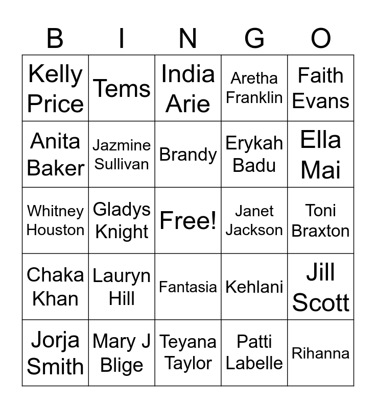 This bingo card has a free space and 40 words: Sade, Whitney Houston, Beyonce, Jazmine Sullivan, Mary J Blige, Fantasia, Brandy, Monica, Faith Evans, Chaka Khan, Gladys Knight, Aretha Franklin, Rihanna, Toni Braxton, Janet Jackson, Lauryn Hill, Mariah Carey, Kelly Price, Alicia Keys, India Arie, Jill Scott, Patti Labelle, Erykah Badu, Anita Baker, HER, SZA, Summer Walker, Keyshia Cole, Tina Turner, Victoria Monet, Muni Long, Jorja Smith, Jhene Aiko, Kehlani, Ella Mai, Teyana Taylor, Ari Lennox, Normani, Tems and Aaliyah.